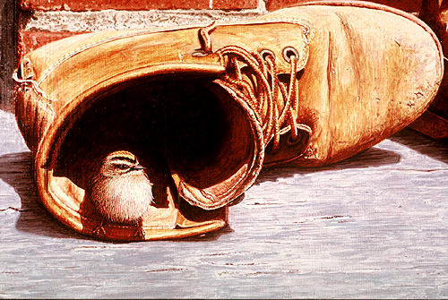 This is one of my favorite paintings. I had an old pair of boots lying around and figured they would look great in a painting. I chose a golden-crowned kinglet because of its perfect size and appropriate colors. I could not have placed the boots any better and chosen a more appropriate bird. |