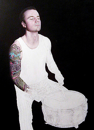 This is an early in-progress shot of the "Fusion" painting. Originally, I had the more ambitious idea of fusing the drum skin with both his hands and drumsticks. I actually finished that version but it looked rather awkward with all three elements turning white and morphing into one another. It looked like an unfinished painting. It just didn't work. I redid it fusing only the end of the drumsticks with the drum skin. There was also the question of whether I should include the drum stand and legs of his seat in the painting. I decided to omit these elements so I could further heighten a certain level of surreal intimacy between Marek and his drum.