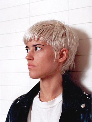 These are photos I took of Sophie for the "Crossroads" painting. She had bleached her hair white at the time. I changed her hair color to black in the painting. I asked her to pose in a 'cool' way, the way James Dean or the Fonz would be proud of. When Sophie leaned on the wall, I noticed the right part of her collar pop up and point away from her. She noticed this as well so she put the collar back down, but I thought it looked better with it up, so she put the collar back up. It was a great decision because it eventually played a part in the painting's narrative. This is the most exciting pose I have ever painted. The jacket is amazing. I like the way the zipper curves into the upturned collar. The jacket was a delight to paint. So much detail, texture, and highlights to capture. I like the way she is holding the helmet on her right hip, tucking the other hand in her left pocket, and curving her body ever so slightly. She nailed the pose. And how about the 'Peace' belt buckle with dove. Perfect. She was an incredible model. She was so calm and in total control when she posed for me, almost blase, exactly the way I wanted her to be perceived in the painting. That's what I like about the painting. What you see is what you get. She's a natural.