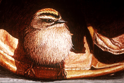 This is one of my favorite paintings. I had an old pair of boots lying around and figured they would look great in a painting. I chose a golden-crowned kinglet because of its perfect size and appropriate colors. I could not have placed the boots any better and chosen a more appropriate bird. |