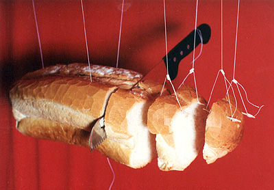 As you can see above, I basecoated the large panel with red watercolor and then added the following objects in acrylics: the bread, basket, Nathalie, arms, knife, my father, flower, and fish. With the acrylics done, I painted the following objects in oils: the large Russian flag, wrench, glove, blood, wine glass, wine, barbed wire, bees, eyes, and shadows.